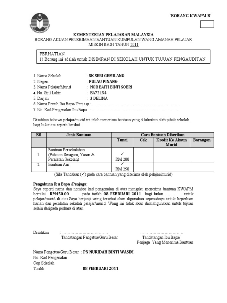 Lampiran B Borang Akuan Penerimaan Bantuan Kwapm Pdf